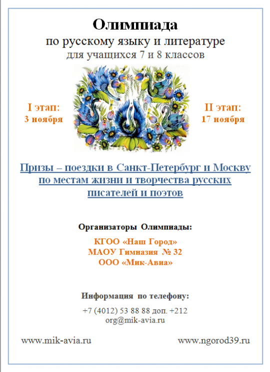 7 декабря 2019 года состоялся Первый (отборочный) тур II Межрегиональной Олимпиады по русскому языку и литературе среди учащихся 6, 7 и 8 классов средних учебных заведений Калининградской и Вологодской областей. Олимпиада проходит в рамках проекта «От русского слова к русской культуре. Культурная нить словесного кружева», реализуемого Калининградской городской общественной организацией по содействию в развитии туризма «Наш Город» совместно с компанией ООО «Мик-Авиа» и при поддержке Фонда Президентских Грантов.